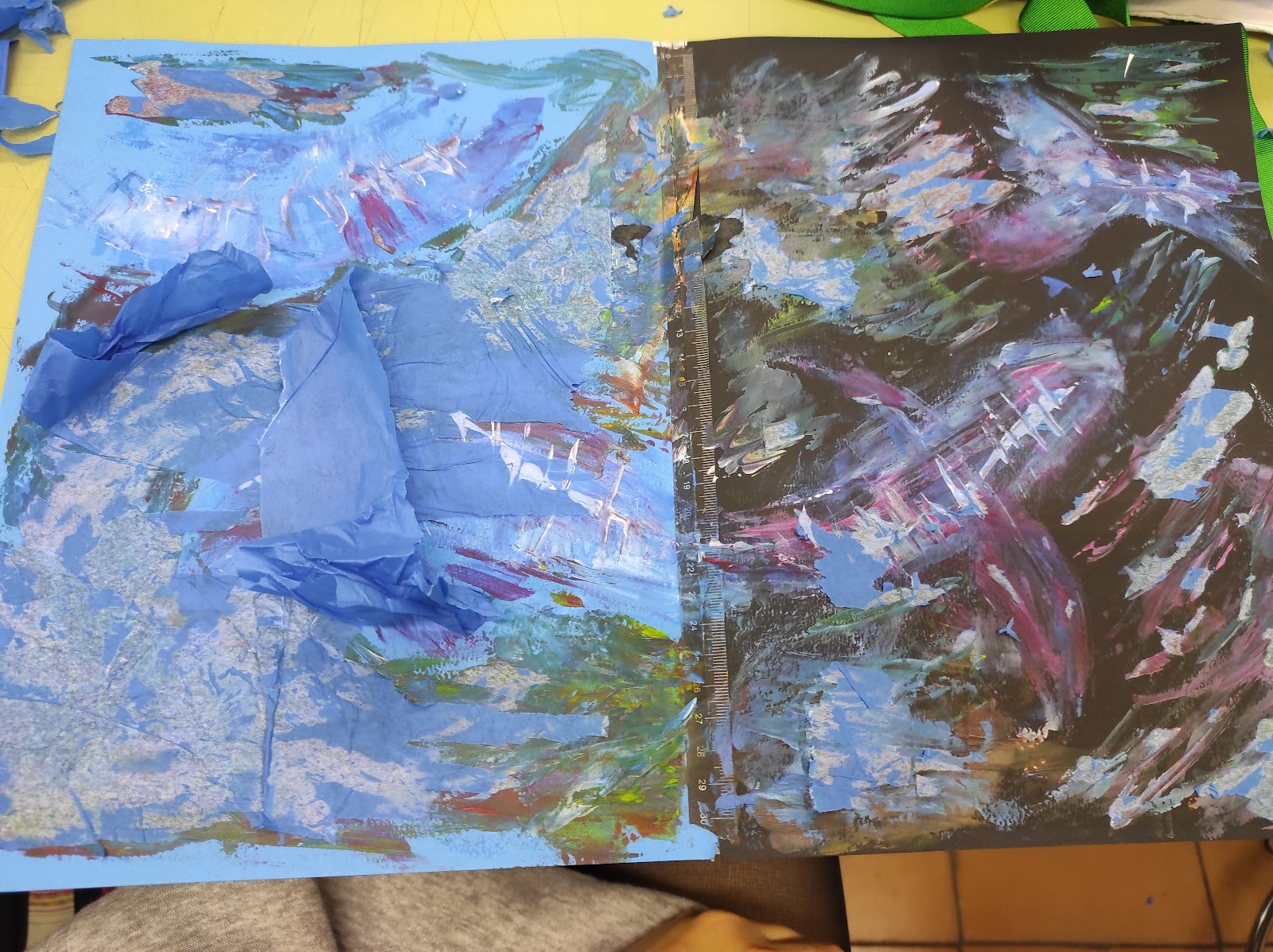Una vez acabada la maqueta 3D continué con la ilustración 2D, comencé situando las manchas que luego me servirían de guía para localizar las orcas en la mancha final: Una vez tenía las manchas de las figuras y el fondo situadas pegué trozos de papel de seda los cuales pasaron por otra capa de pintura: